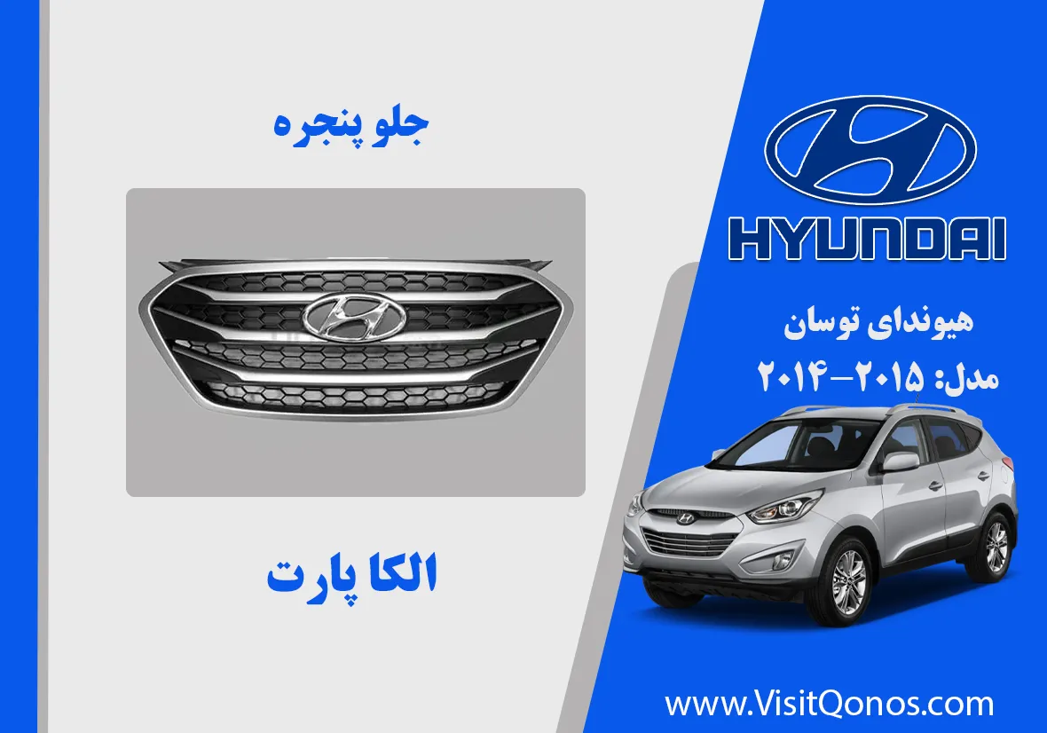 جلو پنجره توسان 2015 دقیقاً در مرکز بخش جلویی خودرو قرار دارد و بین دو چراغ جلو واقع شده است. طراحی آن در مدلهای مختلف ممکن است تفاوت داشته باشد اما در اکثر نسخهها از خطوط افقی یا شبکهای با قاب نقرهای یا کروم ساخته شده است.