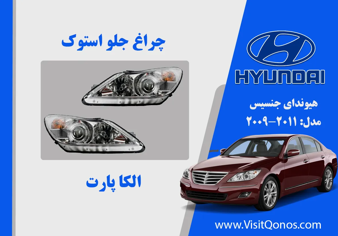 چراغ جلو هیوندای جنسیس استوک مدل 2011 تا 2009 که در قسمت جلویی خودرو به صورت متقارن قرار گرفته اند از اصلی ترین جنبه استفاده از سیستم روشنایی خودرو می باشند که وجود آنها دارای اهمیت می باشند و نبود هریک از آنها باعث اخطار پلیس راهنمایی و رانندگی خواهد شد.